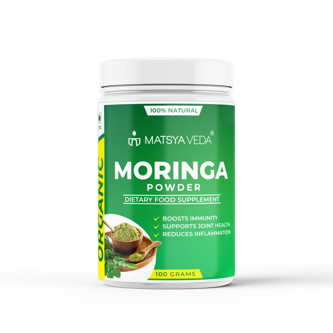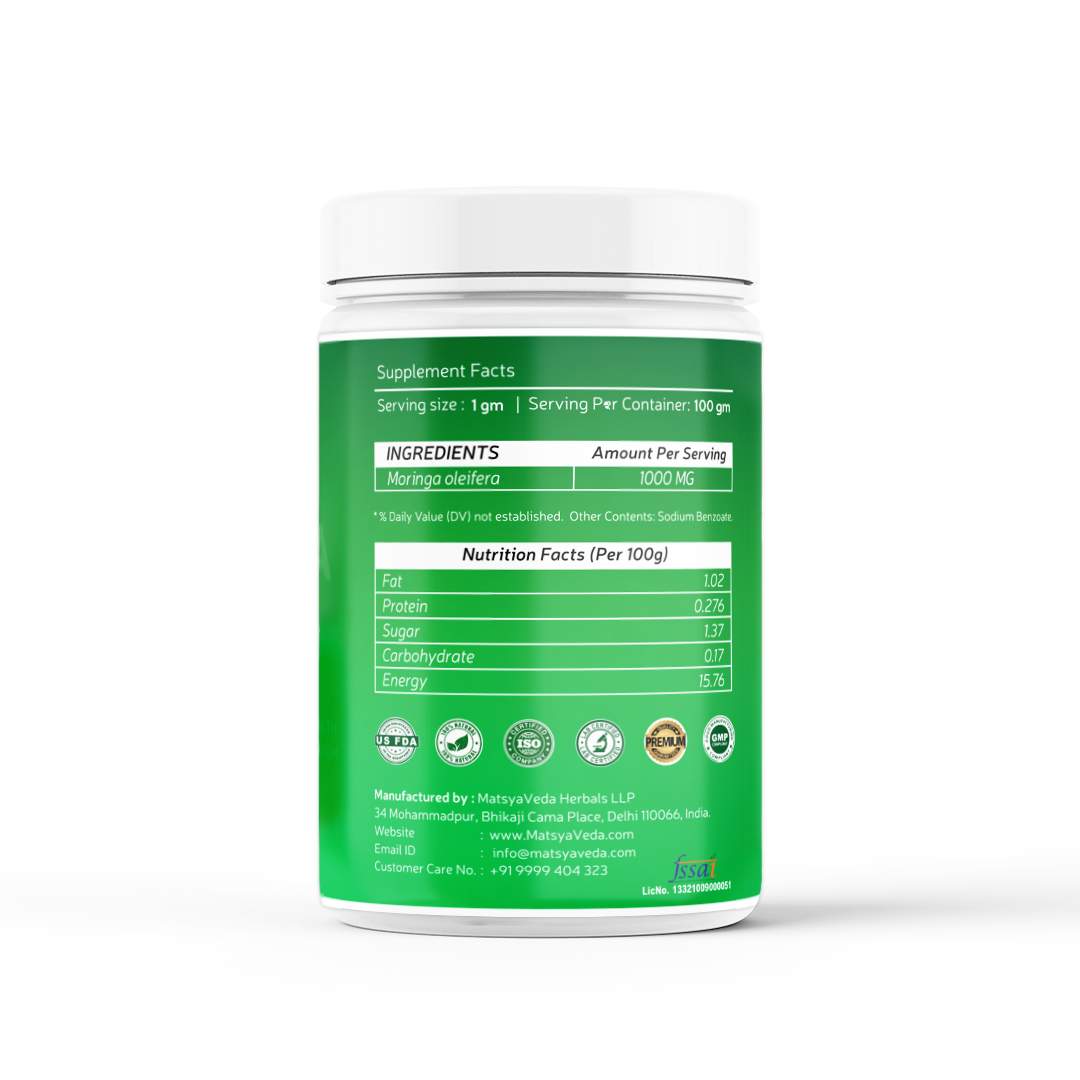 One of the benefits of MATSYAVEDA's Moringa powder is, that it not only improves overall energy levels but also helps strengthen overall immunity and Improves skin health and glow