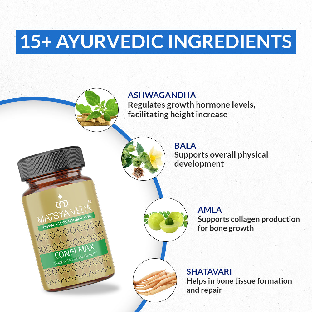 One of the benefits of CONFI MAX is, that it not only promotes Height Gain It is also known to help with secretion of growth hormones in body