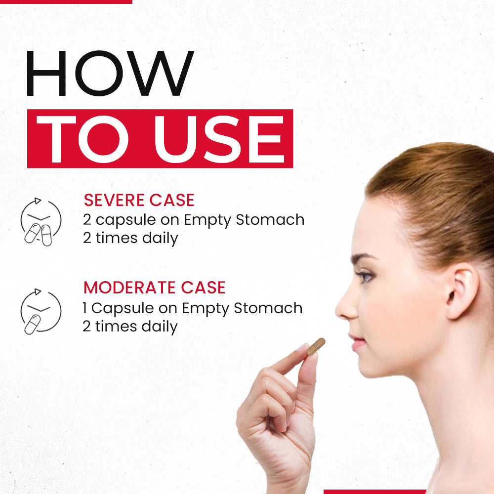 Each capsule is prepared as per the home remedies and Ayurvedic principles. It follows and focuses on the Ayurvedic philosophy of maintaining a balance between the three doshas for the overall health and getting rid of the problem from the root.
