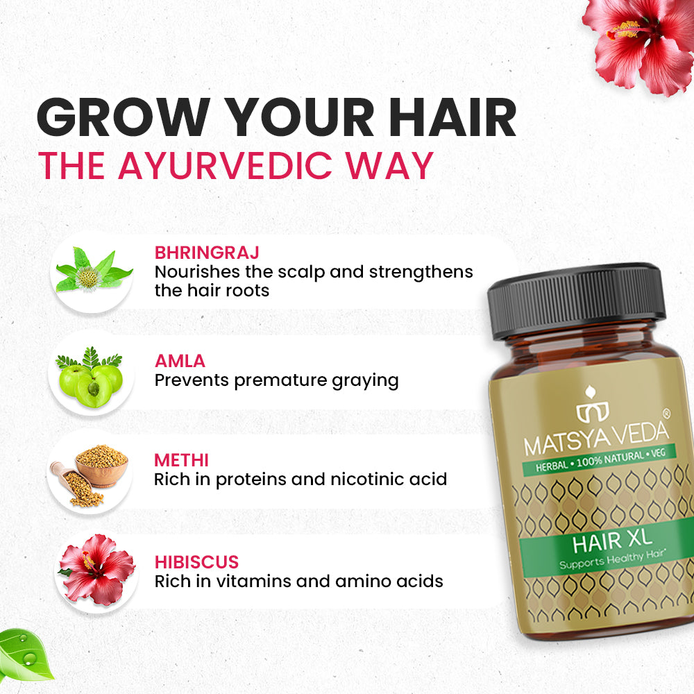 Hair Xl is a nourishing combination of herbs that bolster hair strength and thickness. It promotes a thick, lustrous head of hair. It cleanses the liver, The powerful blend of 76 rare herbs including Bringha, Amla, Aloe vera, Tulsi helps in controlling hair loss & actively stimulates new hair growth. helping the body support hair growth while providing nutrients that support a healthy head scalp.