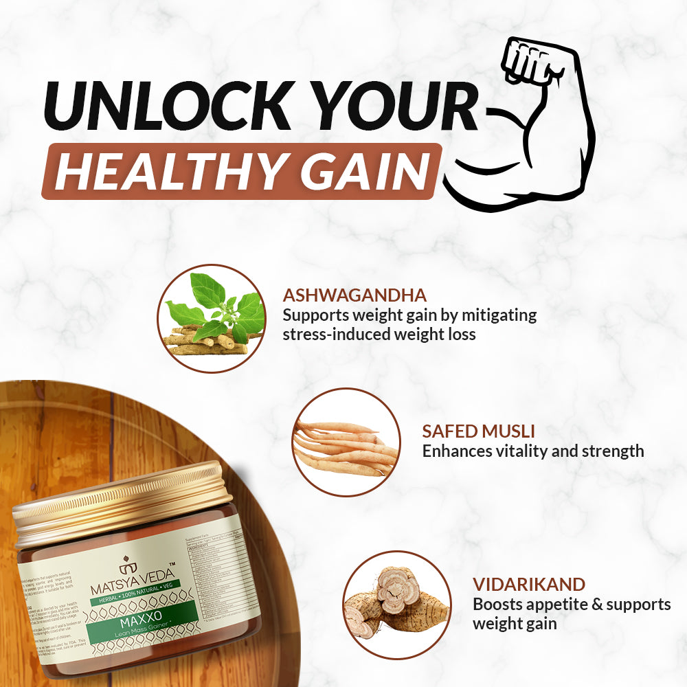 GAIN UP is a tested blend of glorious natural herbs namely Custard Apple, Cinnamon, Shatavari, Ashwagandha, Walnut, Amla, Vidarikand, Safed Musli, Nutmeg, Almonds, Cashews, Dry Dates, Coconut, and Pistachio